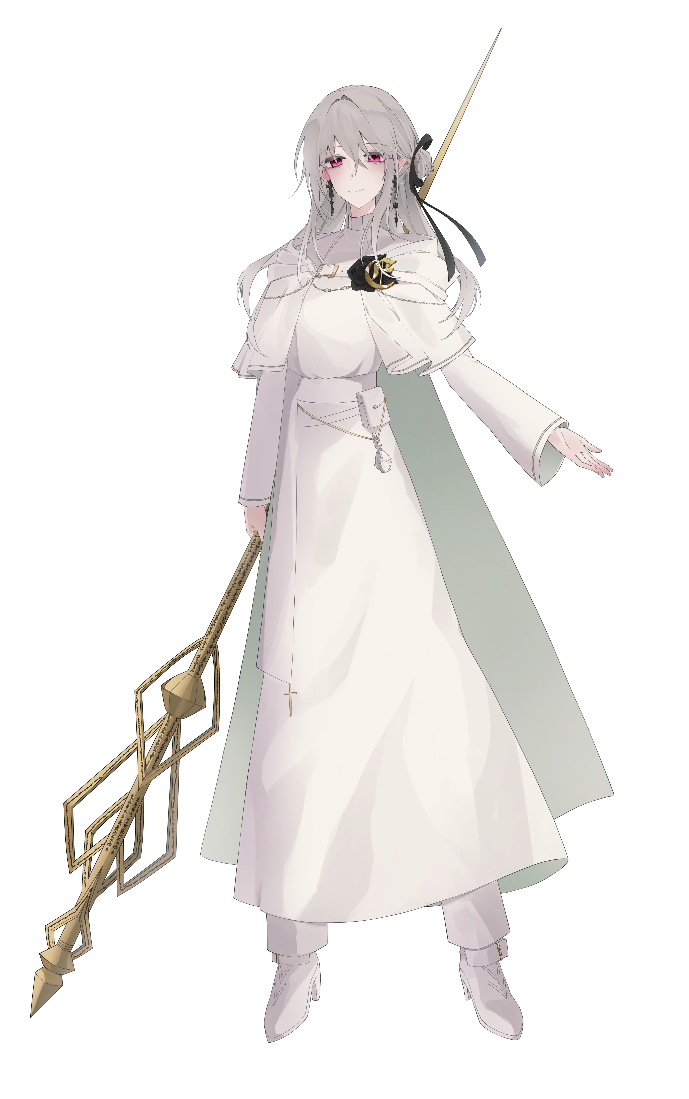 목 아래로는 교단의 사제복을 단정하게 차려입었다. 왼쪽 가슴에 검은 장미와 함께 교단의 브로치가 달려있고, 수단 안에는 흰색 긴 바지를 착용하고 있다. 외관은 갓 스물로 보일 만큼 앳된 모습을 하고 있다.