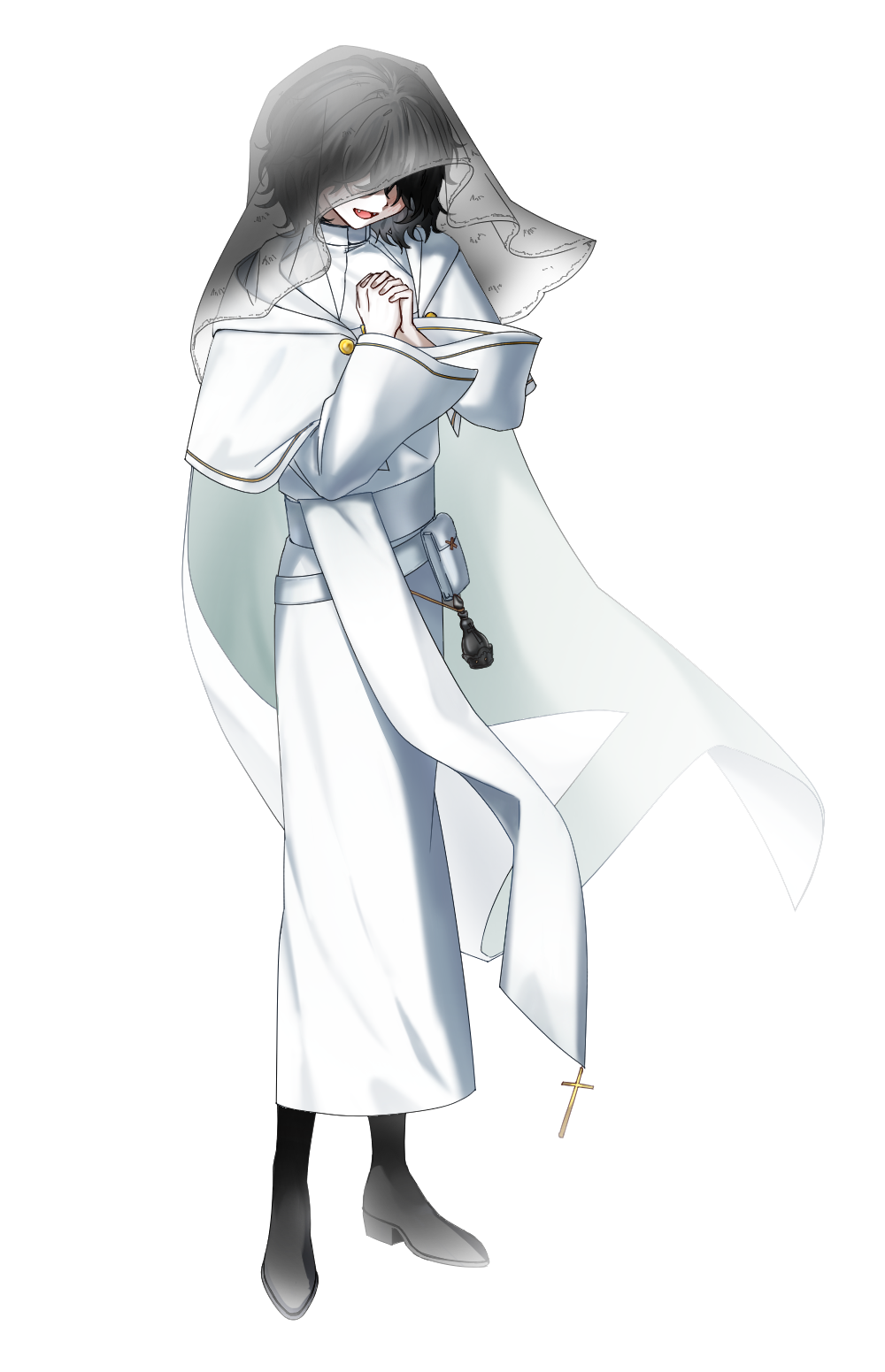 외관 묘사 하얀 뿌리에 검은색으로 끝나는 곱슬 머리카락. 하얀 머리를 검은색으로 염색해서 가리고 있으나 염색의 시기가 한참 지났지만 바쁜 상황 탓에 염색할 기회가 없어 어쩔 수 없이 기른 상태다. 앞머리를 길게 기르고 고개는 늘 약간 아래를 향해 숙이고 있는 데다가 머리에 미사보도 쓰고 있어 이목구비가 잘 보이지 않는다. 가끔 흔들리는 머리카락 틈 사이로 노란색 눈동자가 보일 때도 있다.
