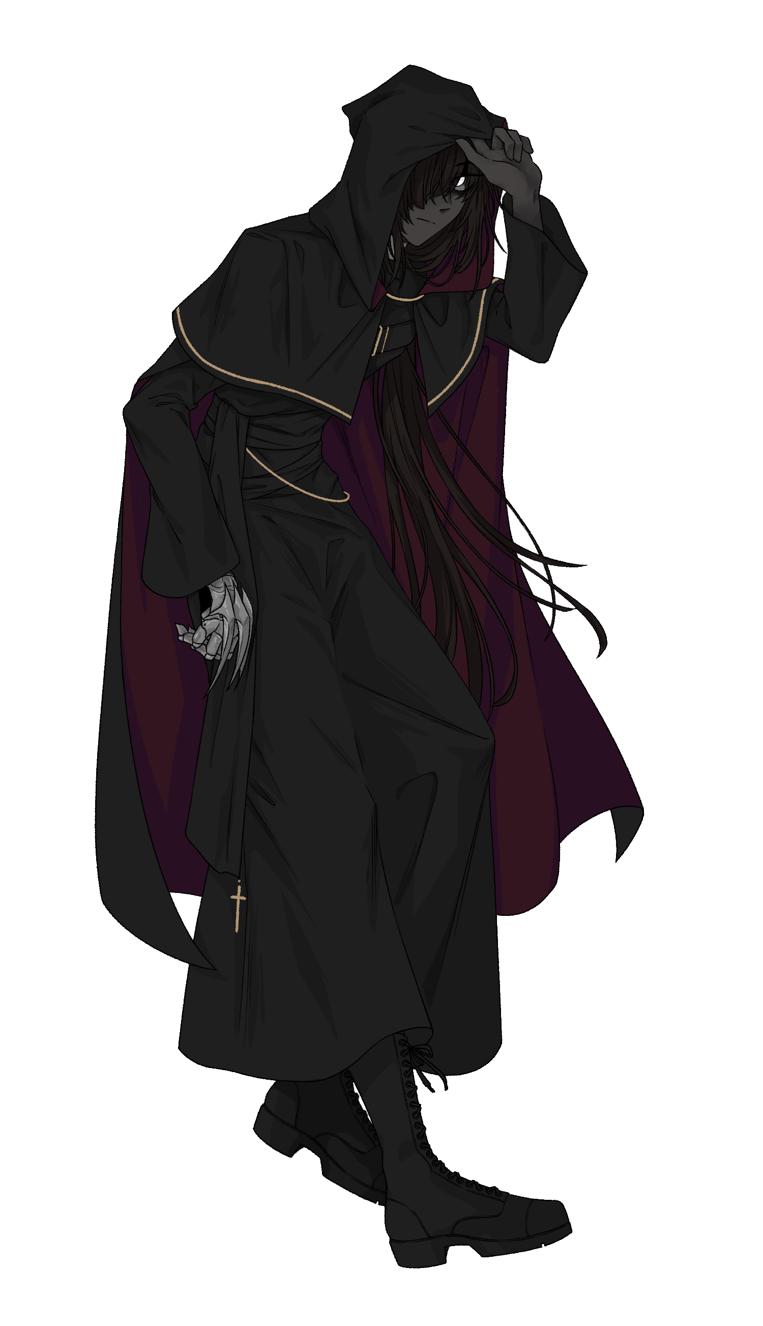 달빛이 도는 백색 눈이 그림자 너머로 얼핏 보인다. 하나로 묶은 암갈색 머리카락은 허벅지까지 길게 내려온다.