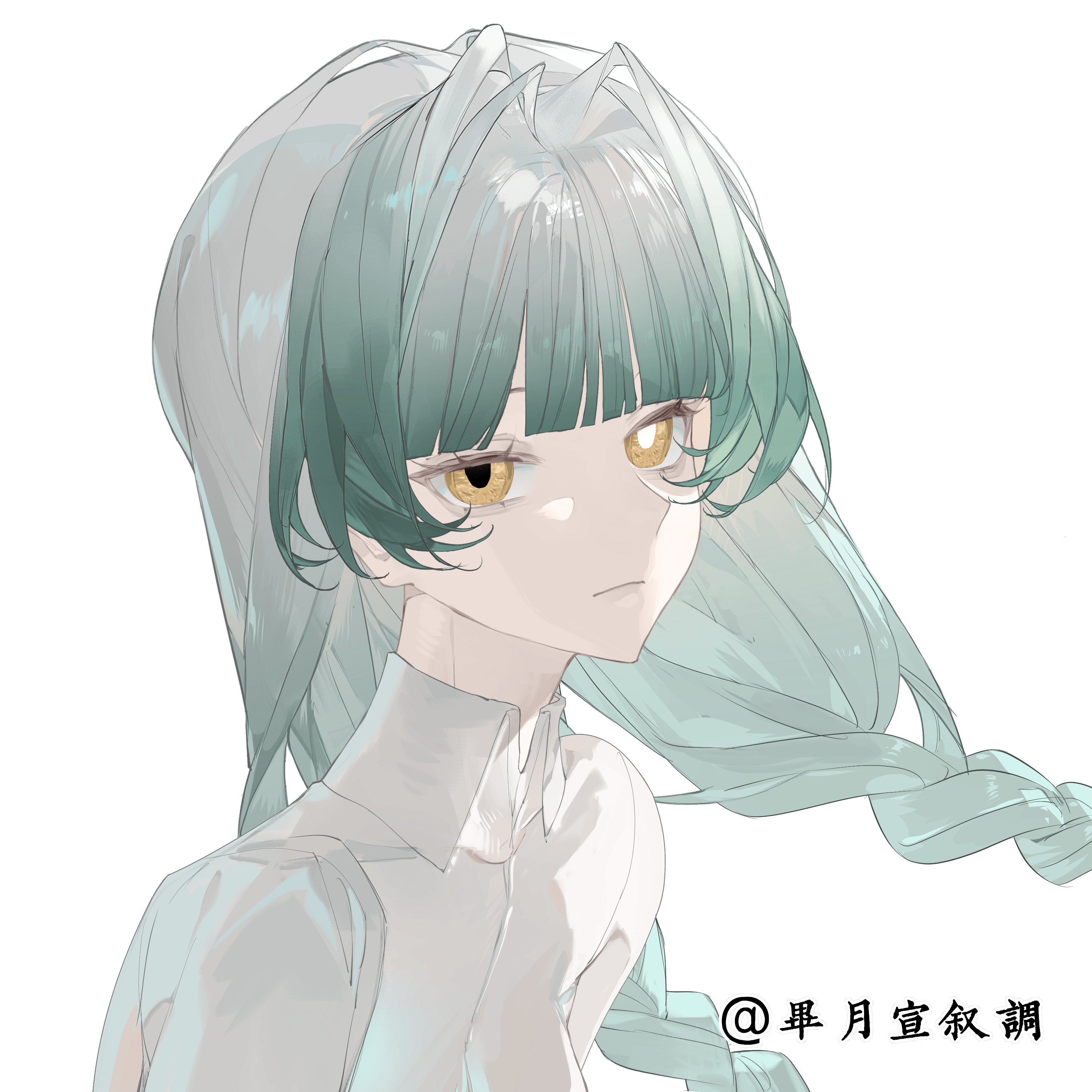 잿빛에 가까운 백색으로 시작되어 청록색으로 이어지는 기다란 머리카락은 양쪽으로 느슨하게 땋아서 늘어뜨려 놓았다. 어깨 너머로 넘겨진 머리카락의 끝자락은 늘 허벅지 근처에서 흔들렸다.